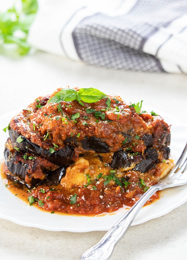 This Italian recipe for Baked Eggplant Parmesan uses roasted eggplant instead of fried making it a simple, cheesy vegetarian meal.
