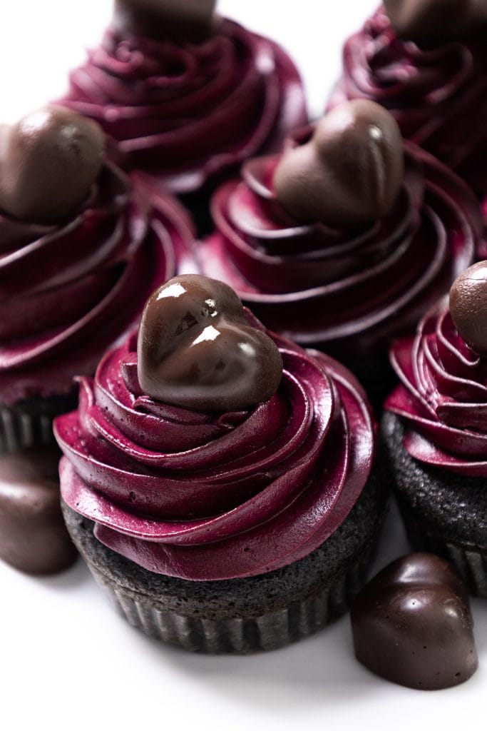 I wanted these black Valentine’s Day cupcakes to look bold and dramatic without tasting artificial or dry. The key was using black cocoa sparingly for color and depth while relying on buttermilk, oil, and butter for moisture. The batter looks almost ink-black before baking but bakes up soft and plush instead of dense. For the buttercream, layering deep red and violet creates a burgundy tone, with just a tiny drop of black to keep it rich rather than muddy.
