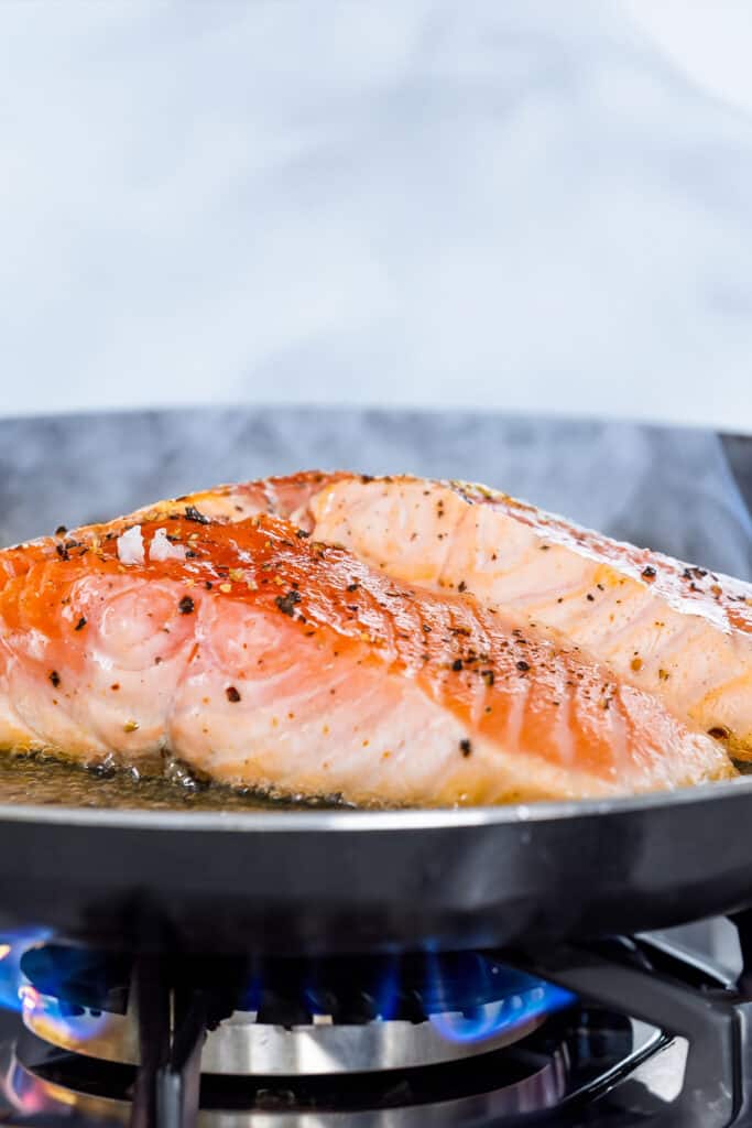 - For an amazing golden brown crust on your salmon ensure your pan is very hot and your salmon has been patted dry before you introduce it to the pan. Try not to skip this step.
