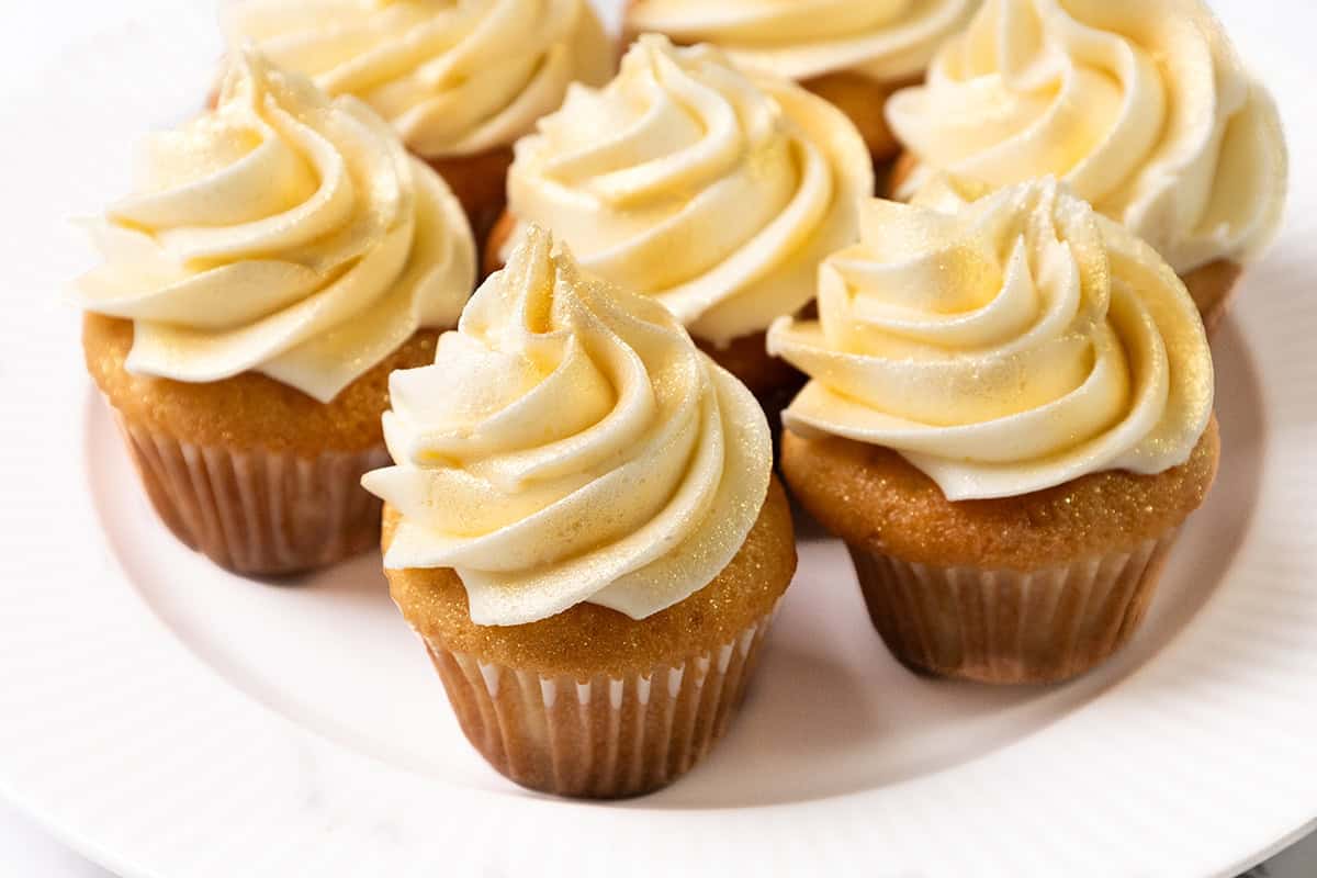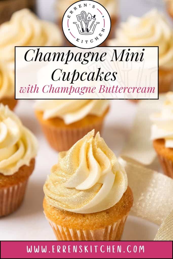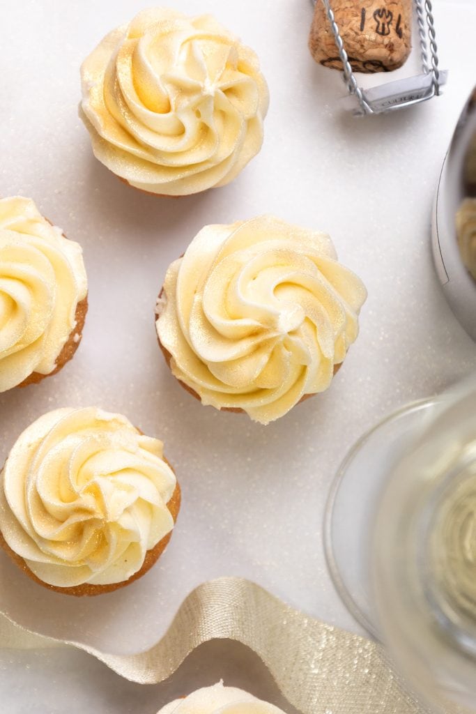 Make these easy champagne cupcakes for any celebration. Light, tender mini cupcakes topped with champagne buttercream and a festive gold finish.