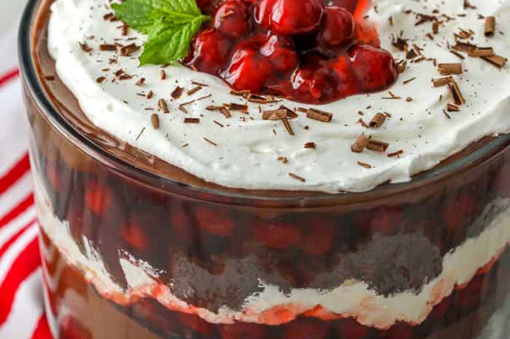A delectable make-ahead dessert loved by all is composed of layers of chocolate cake, chocolate pudding, and cherry pie filling!