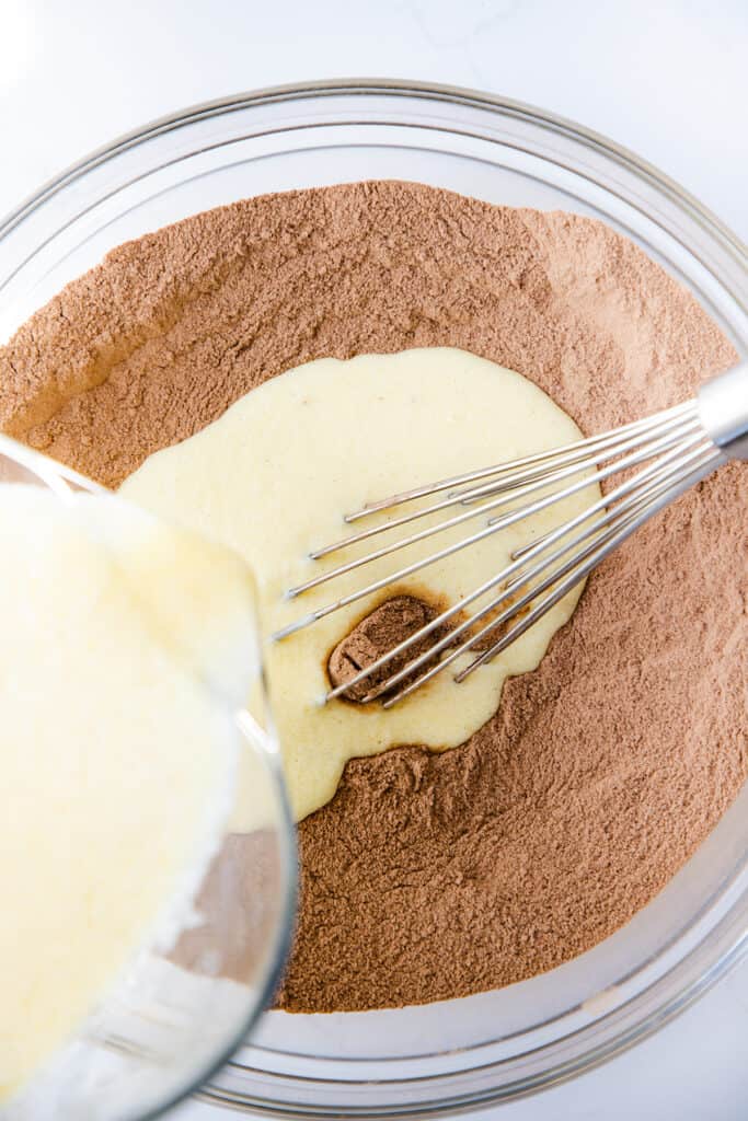 - In a medium mixing bowl, mix together flour, sugar, cocoa, baking soda, baking powder, and salt.