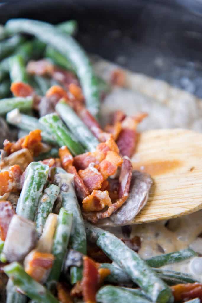 Serving the perfect side dish at a family gathering or holiday dinner is so satisfying. My family goes crazy for my roasted broccoli recipe and my Scalloped Potatoes are a real crowd pleaser that’s hard to top, but this Green Bean Casserole is an example of how you can up your game when it comes to side dishes. I added bacon to this classic casserole, and let me tell you, it’s so delectable you won’t be able to keep your spoon away.