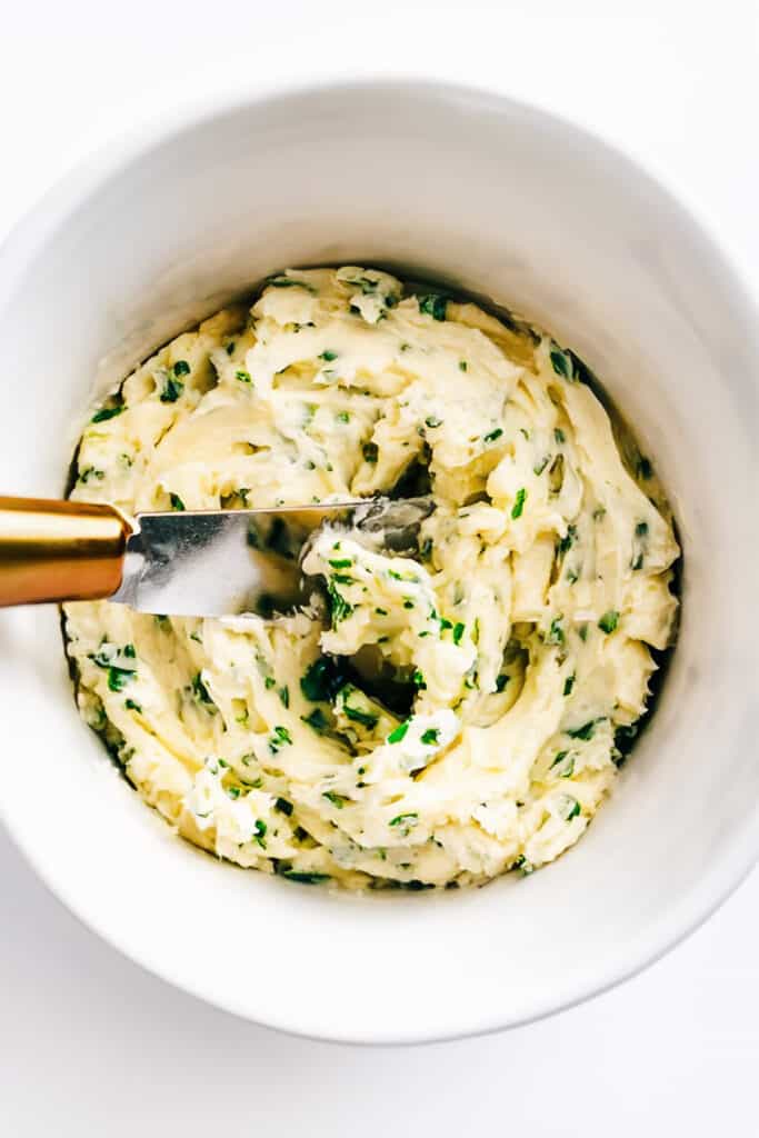 - In a small bowl, mix softened butter with finely chopped herbs and minced garlic. Set aside