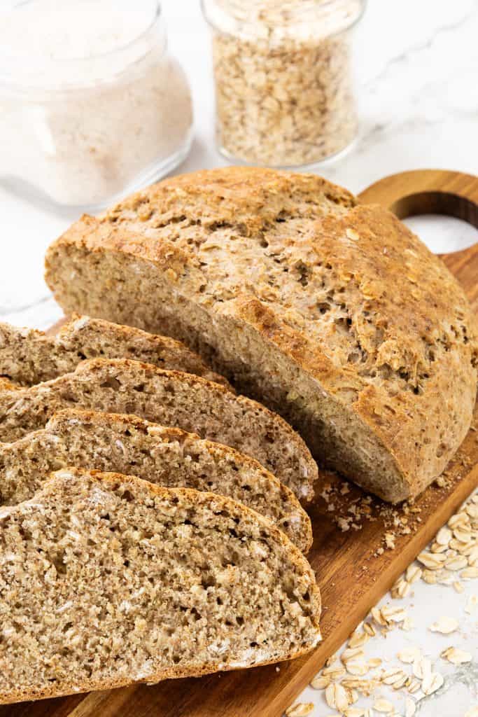A loaf of homemade Irish Soda Bread, partially sliced, rests on a wooden cutting board. Loose oats are scattered nearby, with jars of flour and oats in the background on a white surface.