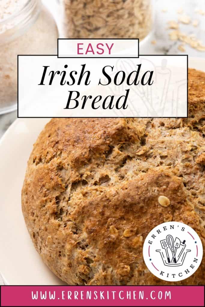 A round loaf of Irish Soda Bread sits on a plate with text reading "Easy Irish Soda Bread" and "www.errenskitchen.com." Oats and flour in jars are visible in the background.
