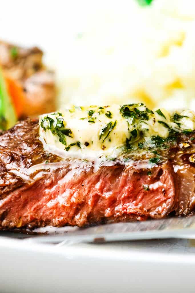 Remove from the heat top with ½ tablespoon of butter and allow to melt. Spread the butter over the steak and allow it to rest until the internal temperature reaches your desired temperature.