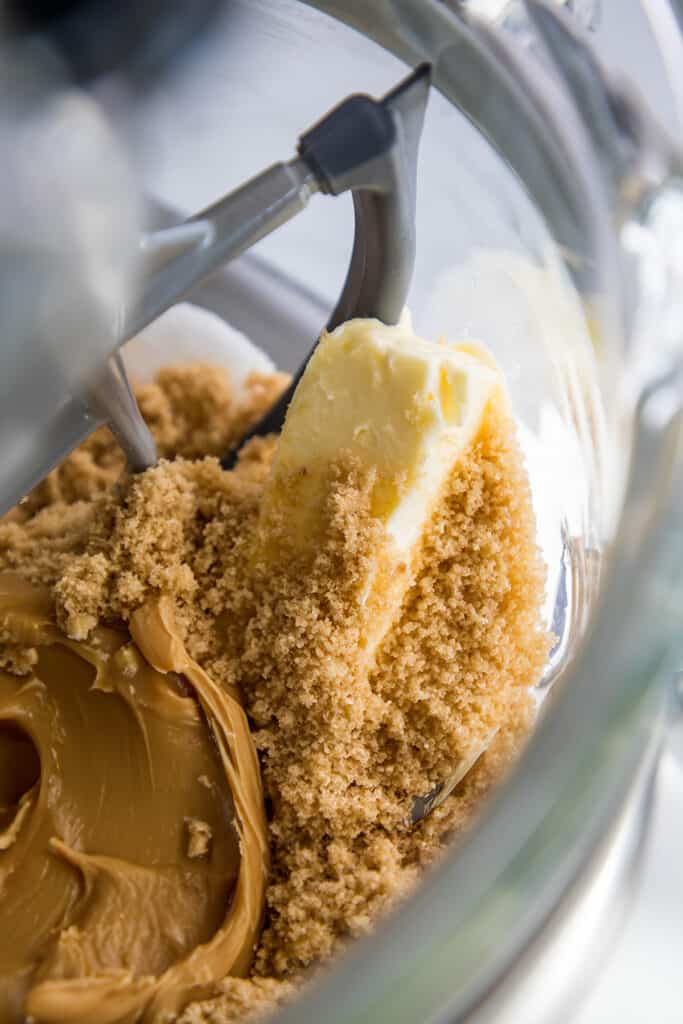 • In a large bowl, cream together the light brown sugar, dark brown sugar, granulated sugar, peanut butter, and butter with an electric mixer until light and fluffy.
