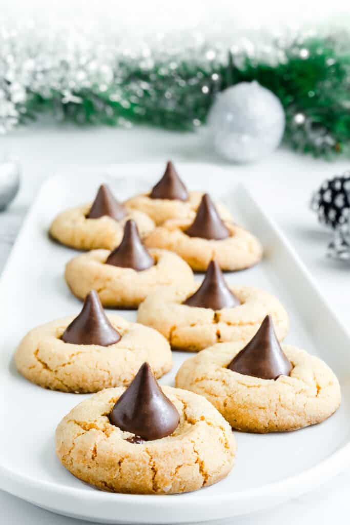 A plate of peanut butter blossom cookies with a festive holiday background.