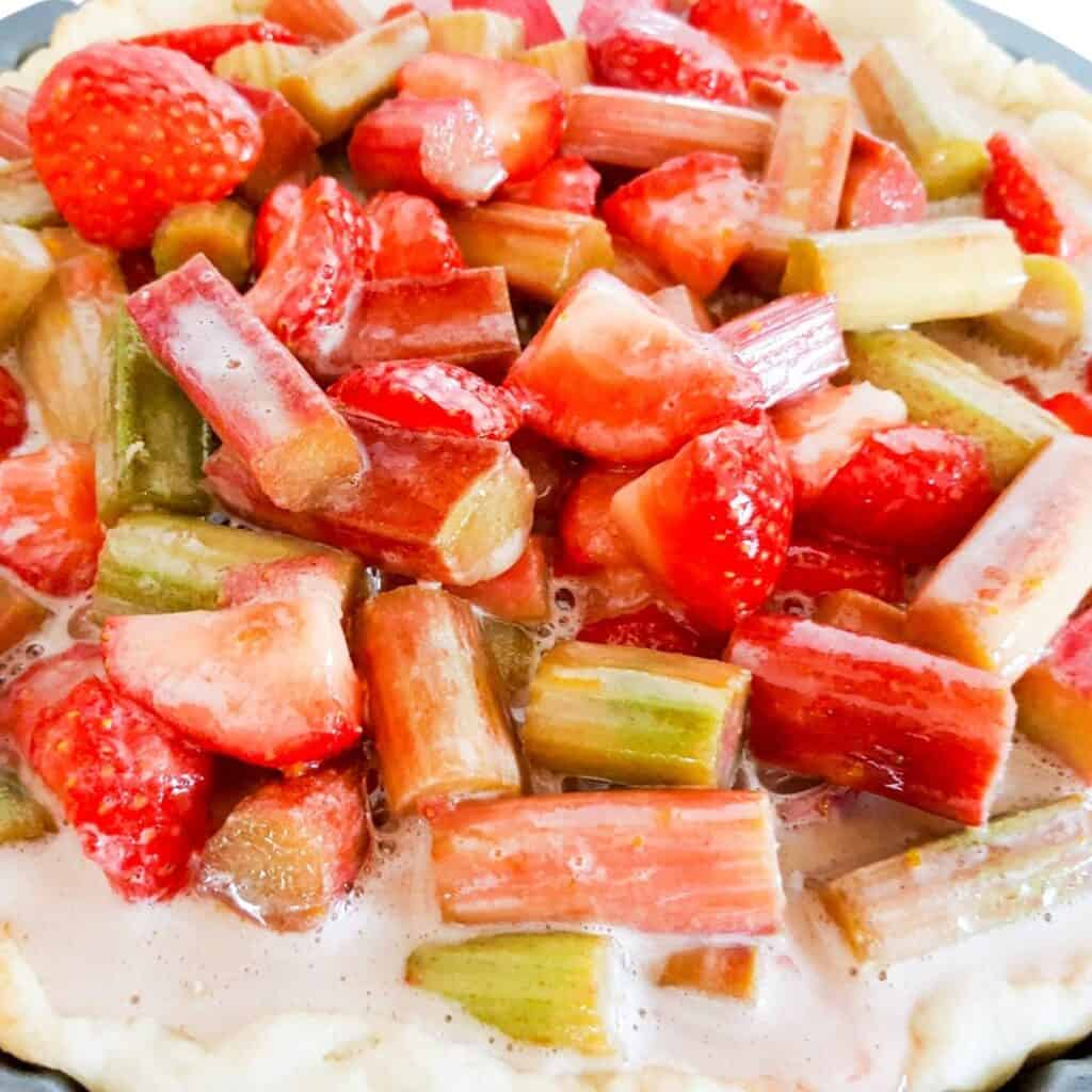 - In a large bowl, combine the sugars, flour and orange zest. Add the eggs and whisk until smooth. Gently stir in rhubarb and strawberries. Add the filling to the pie crust.