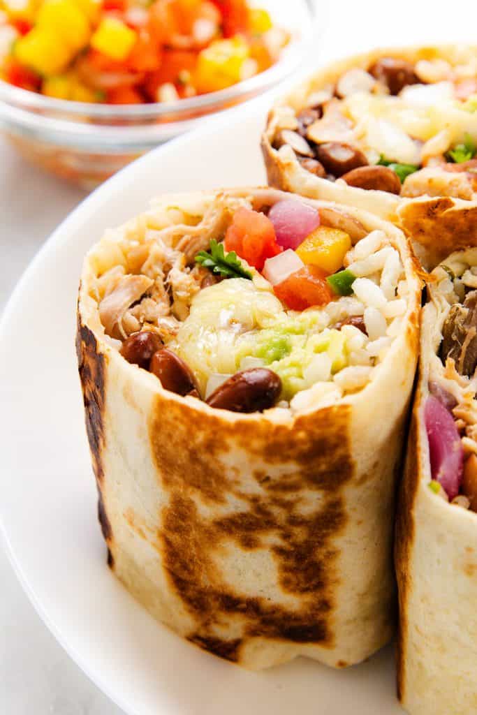 A close-up of a burrito cut in half, showing fillings like rice, beans, slow cooker carnitas, red onions, and diced vegetables, served on a white plate with a bowl of salsa in the background—perfect for burritos lovers.