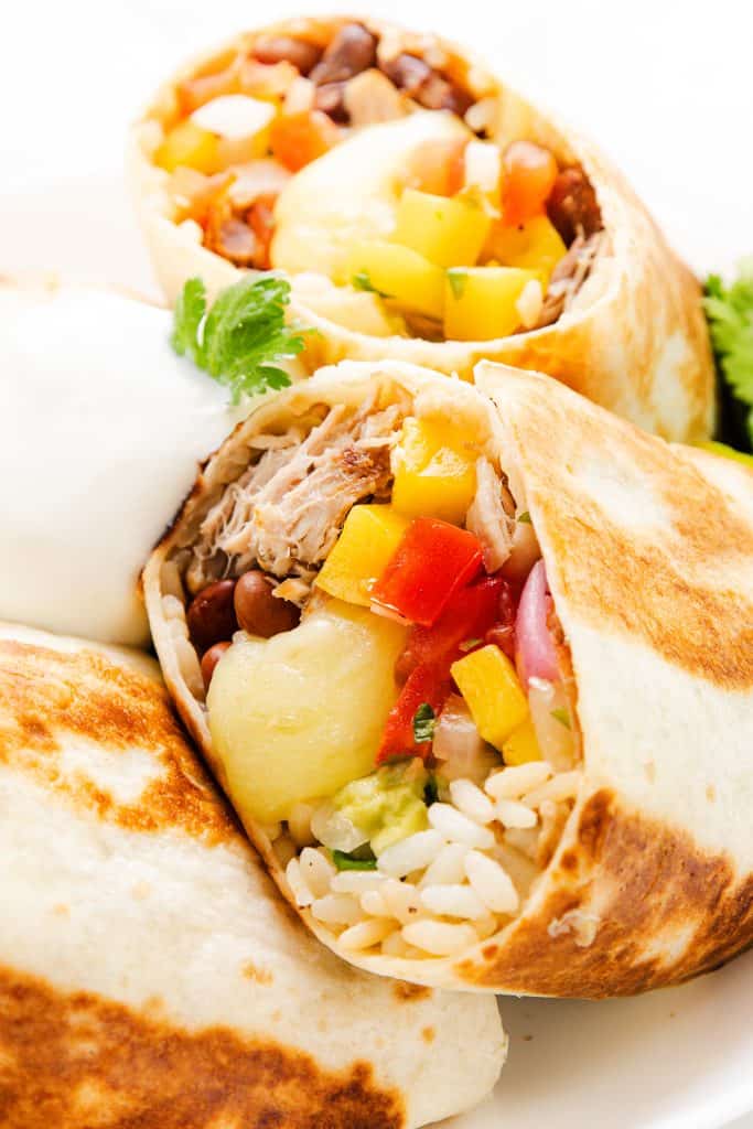 A close-up of a burrito cut in half, filled with rice, black beans, slow cooker carnitas, pineapple, diced tomatoes, red onion, and mango salsa, served with a side of sour cream and garnished with cilantro.