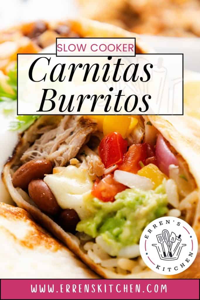 A close-up of a Slow Cooker Carnitas burrito filled with pork, rice, beans, guacamole, tomatoes, and onions. The text reads "Slow Cooker Carnitas Burritos." Logo and website for Erren's Kitchen are visible.