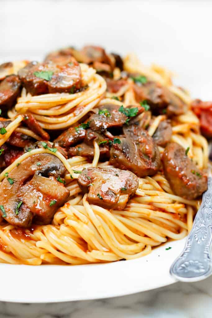 A round white plate overflowing with tangled spaghetti strands, coated in a rich red tomato sauce with earthy-colored sliced mushrooms throughout. Fresh green parsley flakes are sprinkled on top for garnish.