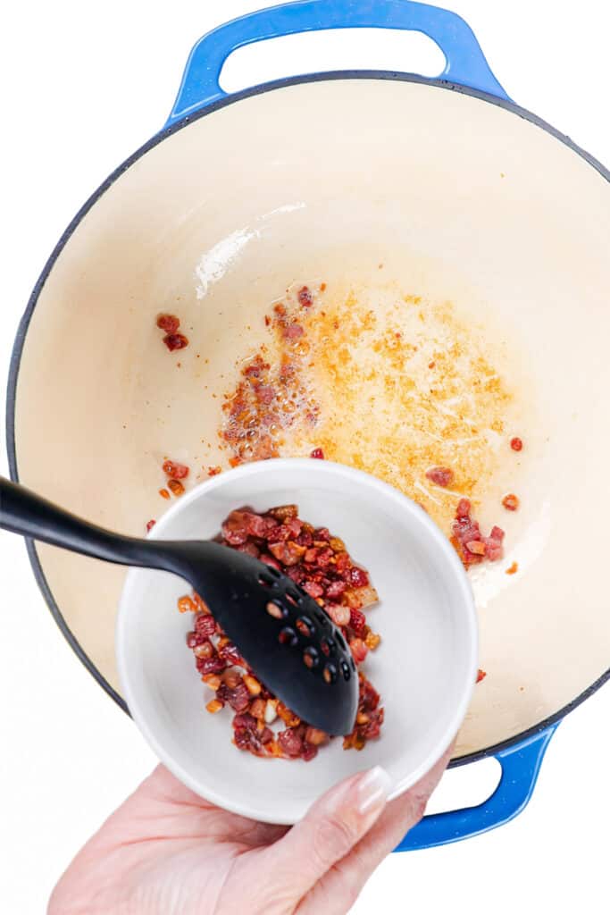 Once the pancetta or bacon is crispy, use a slotted spoon to remove it from the skillet. Leave about a teaspoon of the fat in the skillet for flavor.