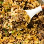 Return the browned beef to the pan and add the egg noodles, stirring to make sure the noodles are mostly submerged in the sauce.